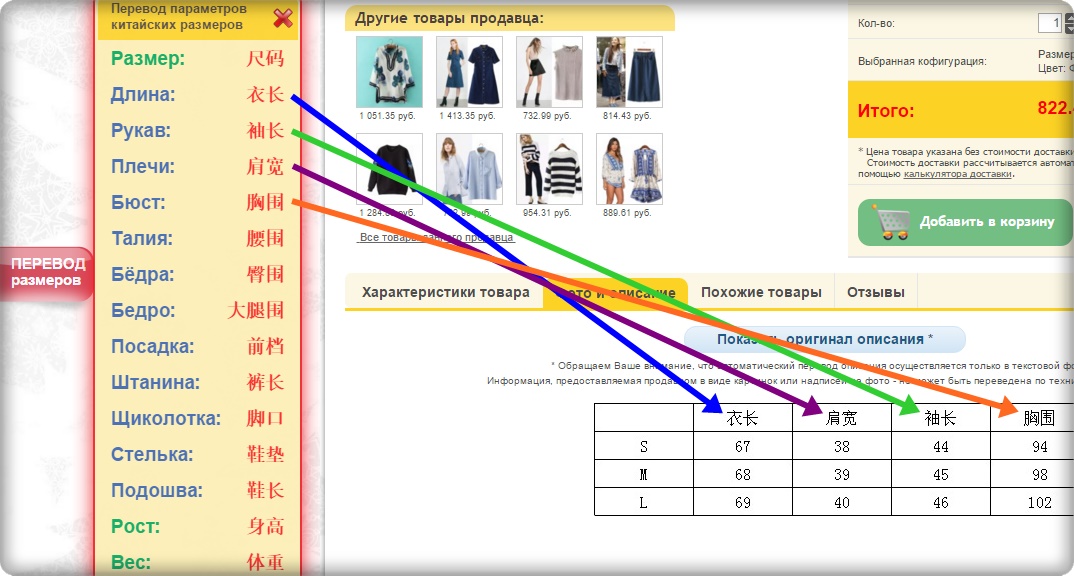 Обычно информация о параметрах размеров размещается продавцом в виде таблицы с текстом, что позволяет нашему сайту выполнить автоматический перевод указанной в ней информации. В таком случае Вам нужно просто сопоставить полученные данные с размерной таблицей товара. Рассмотрим это на примере: